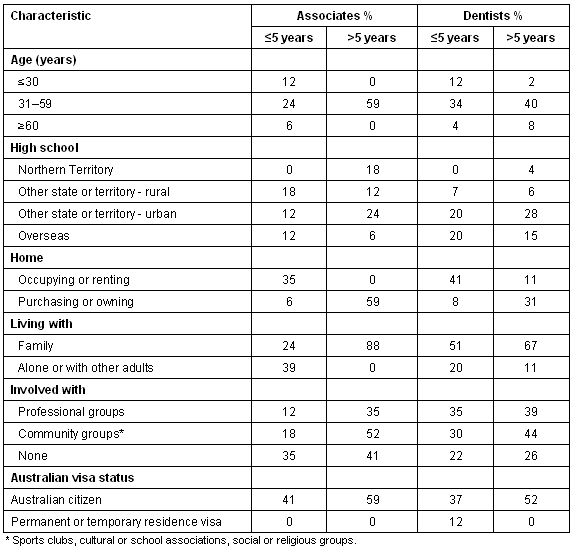 The associates who had stayed more than 5 years tended to be older, more likely to have attended high school in the NT, to be engaged in home ownership, be living with family and be engaged with professional or other community groups (Table 2). Long-staying dentists had similar characteristics, but recent arrivals were, in addition, less likely to hold Australian citizenship. Rural upbringing did not appear to influence tendency to stay in the NT. Dental professionals who attended high school overseas were more likely to be new arrivals (<5 years).
