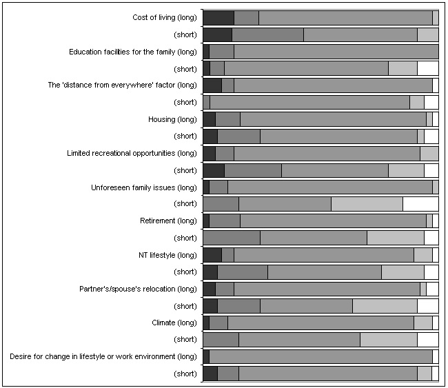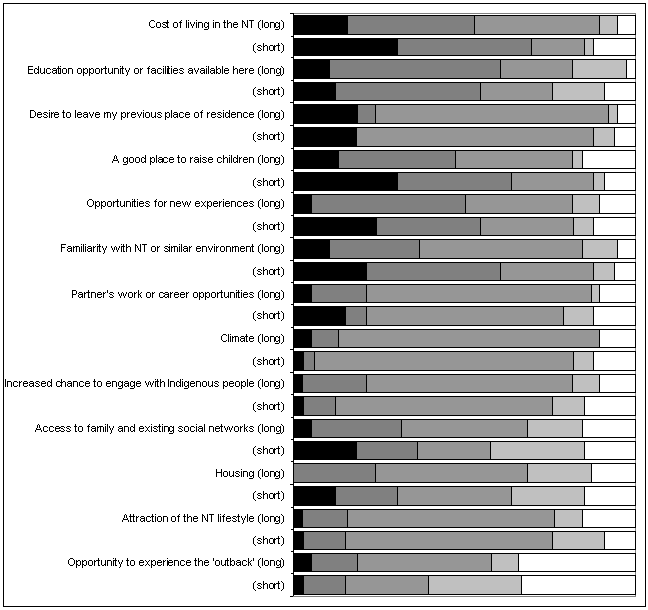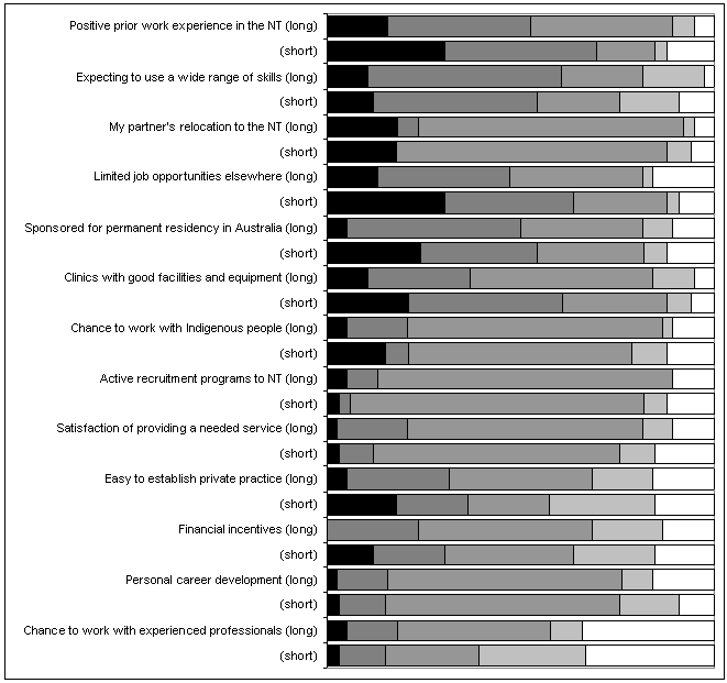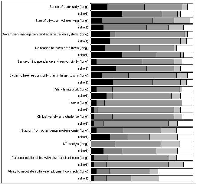 Figure 1: Work-related reasons for coming to the Northern Territory among dental professionals (proportion of respondents; dark: very important; mid-grey: indifferent; white: not at all important; priorities sorted from high to low for long-stayers, ie people staying >5 years).