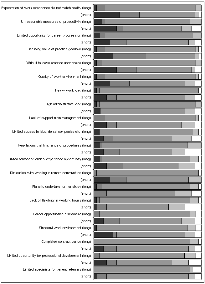 Figure 4: Work-related reasons for leaving the Northern Territory among dental professionals (proportion of respondents; dark: very important; mid-grey: indifferent; white: not at all important; priorities sorted from high to low for long-stayers, ie people staying >5 years).