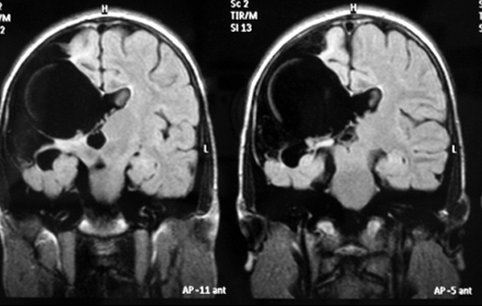Figure 1: T2-weighted FLAIR MRI scan of the patient. Right-sided unilateral parietal clefts were detected, lined by gray matter, connected with right lateral ventricle, septum pellucidum hypoplasia.
