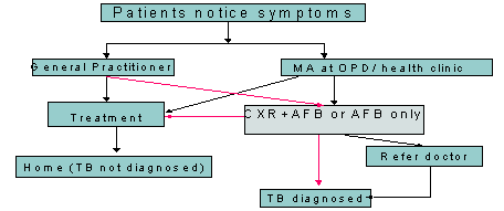 The detection of TB in Sarawak relies heavily on passive case detection where the success is known to be influenced by factors such as patient motivation, degree of diagnostic suspicion by health-care workers and quality of laboratory services3. When patients who have any TB symptoms decide to seek main-stream medical treatment, they have a few options: government health clinics staffed by medical assistants (MAs) or physician assistants; out-patient departments in hospitals staffed by MAs; or private practitioners' clinics. Once TB is suspected, the MAs in the health clinic can request both radiographic and sputum microscopic examinations and then refer the patients to a doctor.