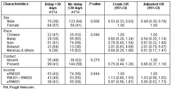 Patient delay was analysed by patient characteristics (Table 1). Significantly fewer male respondents (36%) had a patient delay, compared with female respondents (57%) (χ2 = 7.64 on 1 df, p = 0.006). There was also a statistically significant difference in patient delay by race (χ2 = 9.68 on 4df, p = 0.046), with the Bidayuh ethnic group having the highest (64%) patient delay. Using logistic regression analysis, (Table 1), only being female was associated with increased patient delay. The Hosmer and Lemeshow test provided a χ2 of 5.342 and was not significant (p = 0.142) showing an acceptable fit of the model. Over all 62.3% of cases were predicted correctly as to whether or not they had a patient delay. There was no significant interaction between independent variables.