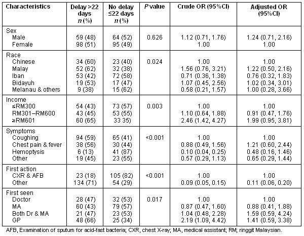 It is recognized that this study has potential limitations due to the data collection method. First, the outcome measure of patient interval was self-reported, implying the possibility of a recall or self-presentation bias. To reduce the recall bias, questions targeted specifically major pulmonary symptoms and how long after the onset of symptoms they sought medical consultation. In addition, religious and other festivals were used to facilitate respondents' recall and to estimate the date of symptom onset. The result of this study may not be generalisable to all smear-positive PTB patients in Sarawak because only patients treated in government health facilities were interviewed, thus excluding patients from private health facilities.