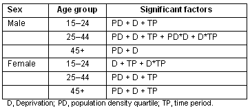 Population density was independently associated with the rates of suicide and undetermined deaths in both sexes and in all age groups other than younger women. Deprivation showed a significant association in all age groups. Time period was independently associated with rates in all groups other than older men. This confirms previous findings on age group and sex, and provides new information on population density and deprivation.