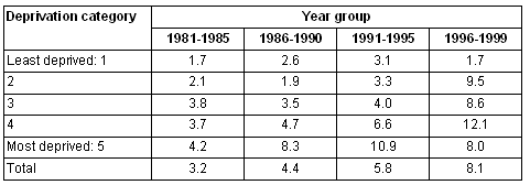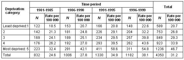 15-24 years: There was an interaction between deprivation category and time period (Table 4). Within each time period, the highest rates were in the most deprived quintile. There were large increases in rates in all but the most affluent quintile. This increase occurred earlier in more deprived groups.