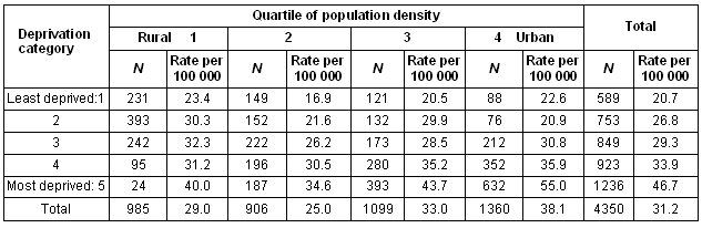 Table 3 shows deprivation and population density. Across all categories of population density, suicide rates increased as deprivation increased. In deprivation quintiles 1 to 3, the highest rates were in the lowest population density group and a J-shaped relationship was seen overall.