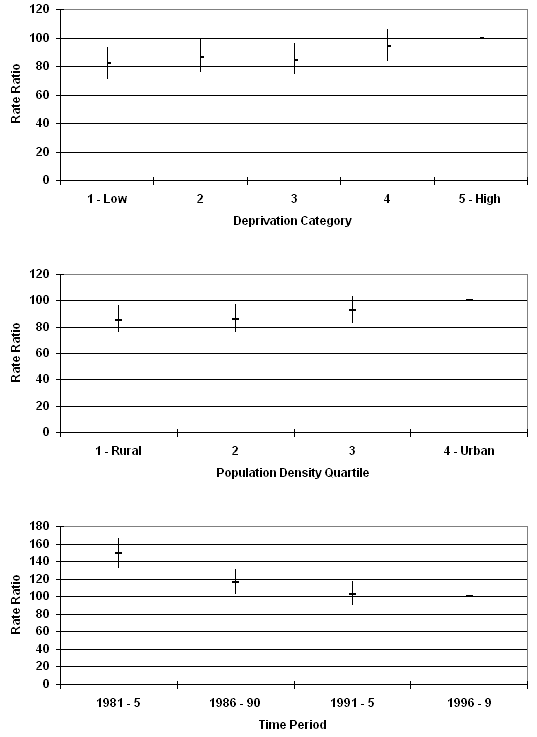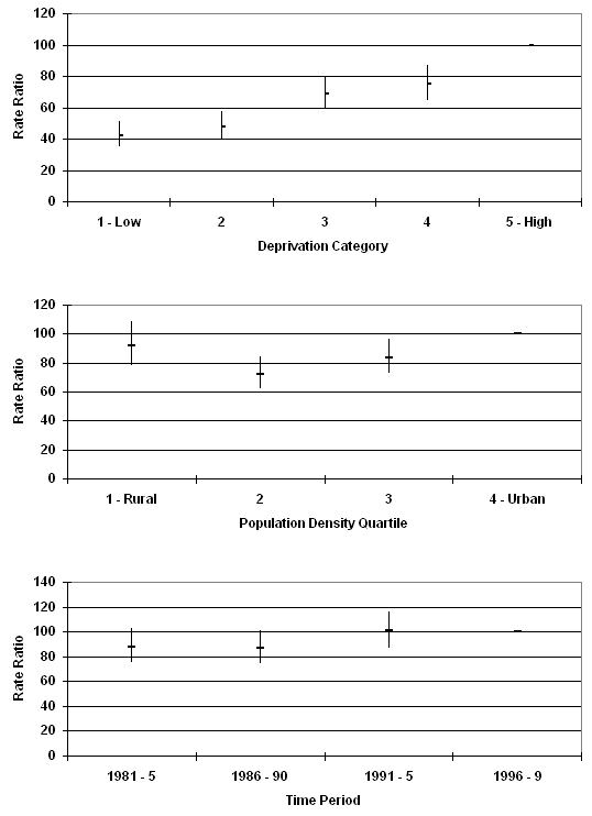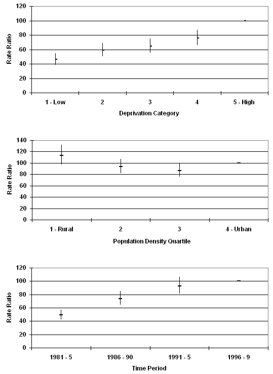 Each postcode sector was assigned a deprivation and density score. Adjustments for differences in deprivation between cases were made using the Carstairs index of deprivation from the 1991 census13. In the Carstairs score, four variables are used to identify the affluence of an area, including unemployment, lack of a car, overcrowding and social class. There are limitations to the application of the Carstairs score in rural areas, because limited public transport may mean that car ownership is essential, even when it imposes a substantial financial burden. It is, however, the only national deprivation score available for Scotland in the whole of the time period reviewed, and is therefore used in this study. The index was categorised into quintiles (1 = the most affluent areas, 5 = the most deprived areas).