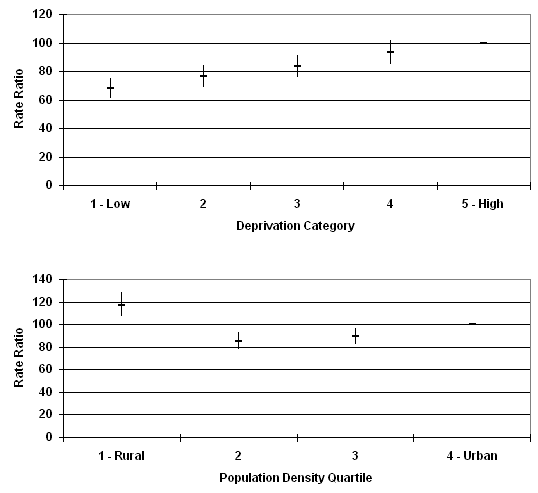 45 years and over: Rate ratios increased as deprivation increased (Fig 2). The highest rates were in the most rural areas followed by the most urban, with intermediate rates in the other population density quartiles.