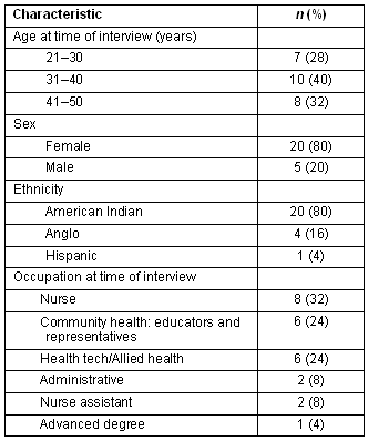 Twenty-five personal interviews were conducted between February and April 2003. A total of 37 individuals had originally been invited to participate. Six declined because of time constraints, and six did not attend at the scheduled time. Table 1 shows the occupational and demographic characteristics of those interviewed. The duration of the interviews was between 30 min and 60 min. Two types of findings are reported: (i) those themes that were found to recur within interviewees' stories; and (ii) notable patterns across interviews identified by the outside perspective of the interviewers.