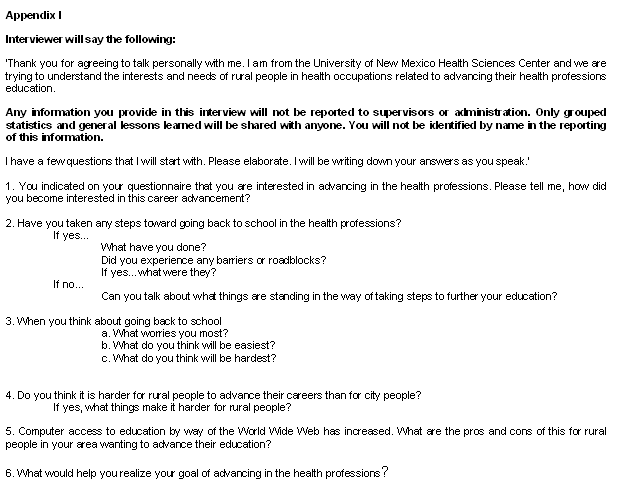Interviews were jointly conducted by two investigators (BO and LP). A semi-structured questionnaire that included six open-ended and two closed-ended questions guided the interview sessions (Appendix I). The questions were designed to prompt the interviewee to tell their story of trying to go back to school to advance in their health career. Questions were focused to elicit the interviewees' views of barriers and facilitating factors as they considered or tried to take career advancement and education steps. Other than framing the questions on barriers or obstacles and factors that would help no options from the literature or prior work were introduced to the interviewees in this part of the study. Investigators took notes by hand independently during actual interviews. Review was undertaken of both sets of notes by both interviewers simultaneously in order to obtain agreement on content. One final set of agreed-upon notes was entered into a word processing program within 3 hours of the interview.