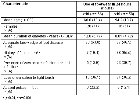 Footwear use was analysed according to two groups: above or below 10 hours of use per 24 hours. The 10 hour cut-off was used because it approximated footwear use throughout most of the daytime. Knowledge of diabetic foot disease and care was tested using 10 questions on foot hygiene. These included basic knowledge on: how to self-examine the feet; steps to follow when cleaning feet and cutting nails; the contribution of ill-fitting footwear to foot disease; basic care of an injured foot; and the complications of diabetic foot disease. As the questions were simple, knowledge was considered adequate if the optimum score of 10 was achieved. A χ2 test was used to compare data between the groups.