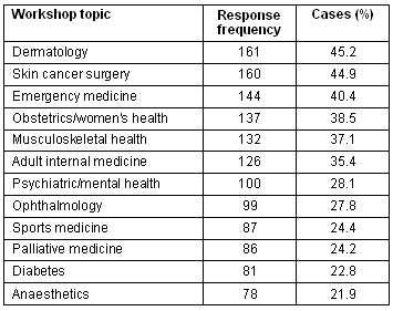 Health Workforce Queensland normally conducts approximately 15 CME workshops per year over 30 to 35 days. Table 1 provides a list of workshops provided in 2006. Between 230 and 250 rural GPs attend these workshops annually. The workshops differ from those offered by many other medical education providers in that they are designed specifically for rural and remote GPs and the types of presentations they are most likely to encounter in their communities. Workshop topics and themes are based on workshop feedback in terms of future topic preferences as well as an annual Educational Needs Analysis Survey completed by rural and remote medical practitioners. Table 2 provides the 12 most popular themes for 2007 based on responses from 369 GPs. The workshops utilize a variety of presentation formats and tend to incorporate hands on skills station scenarios and simulation utilising the types of facilities and equipment available in rural and remote communities. Travel and accommodation to attend these workshops are subsidized by HWQ with first preference given to medical practitioners in more remote locations. Depending on availability, rural and remote GPs in RRMA 4 to 7 locations10,11 are eligible for locum support when attending CME workshops. Alternatively, where locums are not available, workshops attendees are entitled to locum rebates.