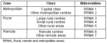 The RRMA classification consists of three zones (metropolitan, rural and remote) and seven classes (Table 3) and combines a distance measure with a population density measure.