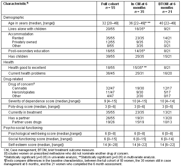 Table 1: Baseline characteristics of women in the outcome study: all women at baseline, women still in case management at 6 months, women with 6 month BTOM