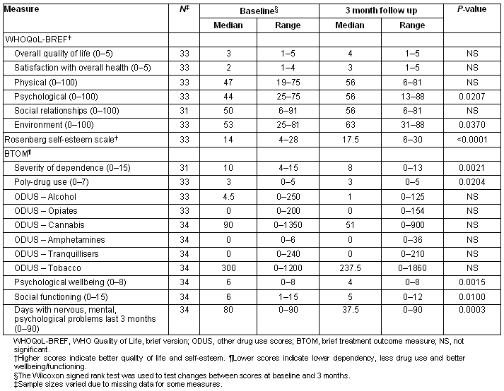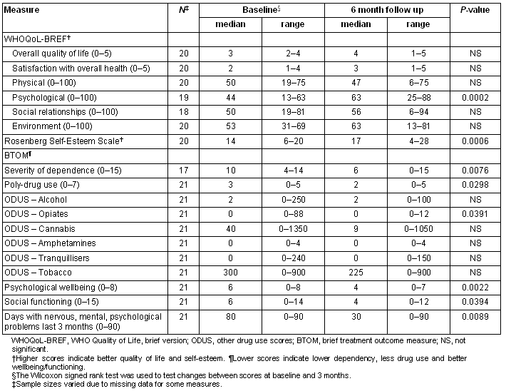 Significant improvements were found on a number of the BTOM median scores between baseline and 3 months: severity of dependence (from 10 to 8, p = 0.0021); poly-drug use (from 3 to 3, p = 0.0204); psychological wellbeing (from 6 to 4, p = 0.0015); social functioning (from 6 to 5, p = 0.0100); and the number of days women reported psychological problems in the last 3 months (from 80 to 37.5, p = 0.0003) (Table 2). Decreases in the use of cannabis and tobacco, the most widely used substances, were found but were not significant. The same significant results were observed between baseline and 6 months (Table 3). The data also suggest a continuous reduction in the severity of dependence and a continuous improvement in social functioning over 6 months; however, the small sample size did not allow for a statistical comparison over time.