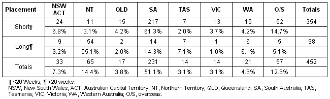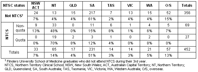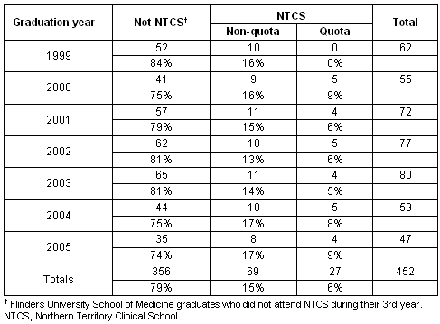 Our analysis was undertaken to evaluate the training experience and internship placement decisions of 452 Flinders University graduates from 1999 to 2005. Ninety-six of the students included in the study undertook their third year of training with NTCS, including 27 enrolled through the NT/Aboriginal and Torres Strait Islander quota program (Table 1).
