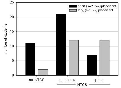 NTCS students spent a significantly greater period of time in the NT during their final (4th) year of the Flinders Medical program than non-NTCS Flinders medical students (16.7 ± 7.9 weeks vs 1.9 ± 3.9 weeks; p<0.01). Placements completed by NTCS quota students were, on average, 25% longer than non-quota students' placements (20.4 ± 8.9 weeks vs 15.3 ± 6.9 weeks; p<0.05).