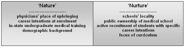 The factors that influence medical student recruitment and retention, especially in regard to the rural workforce, remain a topic of considerable interest and research. Such factors were identified in a recent report5, which reviewed and compiled key outcomes of 21 multivariate cohort studies undertaken in US medical schools between 1990 and 2000. In this analysis, individual factors were characterised as deriving by 'nature' (pre-medical school - inherent to the student or resulting from their upbringing) or 'nurture', that is factors influenced by the medical training experience (Fig 2). This differentiation is useful in terms of identifying issues relevant to recruitment tactics and for developing approaches to 'nurturing' future practitioners through the curriculum and training experience.
