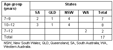 Data were collected using focus groups in rural schools, because this method gave an insight into the ways in which children talk about risk-taking behaviour14, and encouraged a dialogue between focus group participants and facilitators when exploring young peoples' perceptions and ideas. Seventeen focus groups were conducted with an average of eight participants in each of the focus groups (Table 1). The sample included children aged between 7-12 years. Focus groups were generally split into two age cohorts: 7-9 years (seven focus groups) and 10-12 years (eight focus groups). Two focus groups were also conducted with students in a composite age range of 7-12 years, due to the small number of students in those schools. The focus groups were run in a variety of rural settings, including different agricultural commodity regions. While not all students lived on farms, all lived either on, or in close vicinity to, farms.