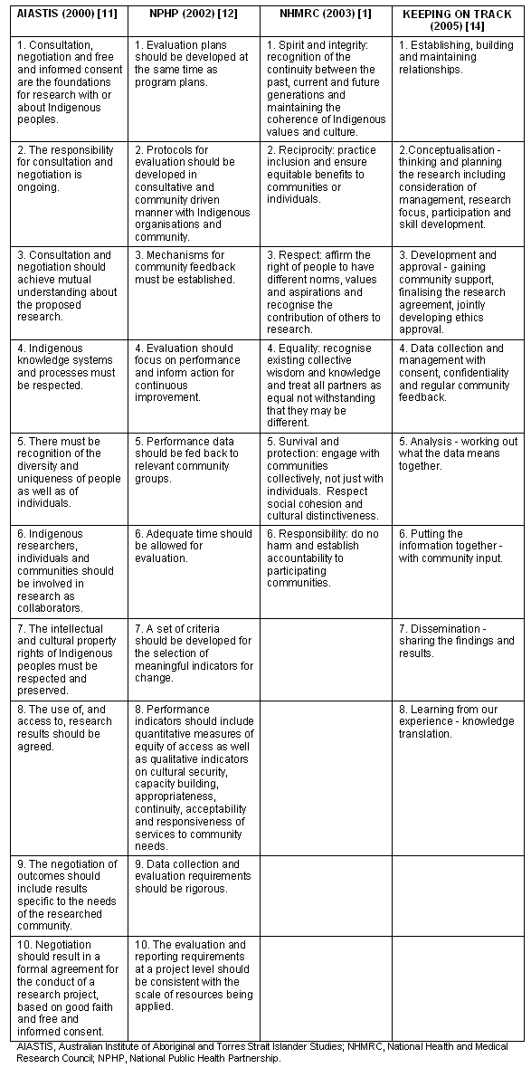 The common feature of these documents is a set of principles founded on respect for Indigenous people's inherent right to self-determination and maintenance of culture and heritage. Table 1 summarises the broad principles for ethical research showing the emergence of relatively common principles for the conduct of ethical research over time.