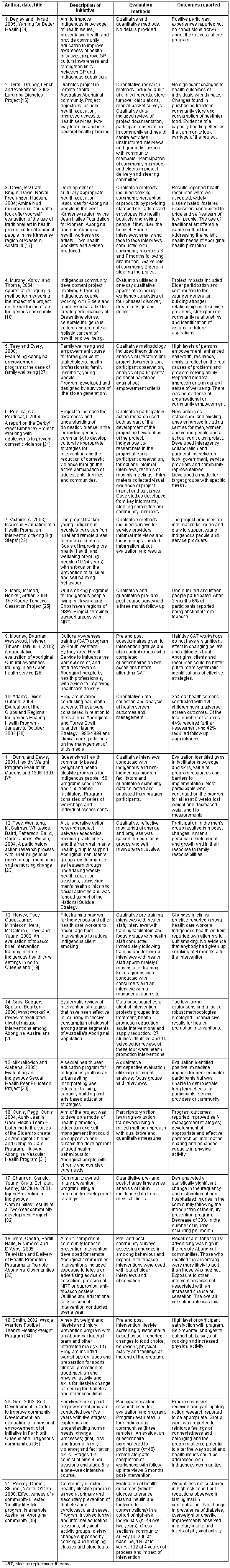 Table 2 summarises 21 evaluation studies of Indigenous health promotion initiatives. Of these, a total of 10 used qualitative methods only, two employed quantitative methods only, eight reported using mixed method approaches and one study was a systematic review. Most of the programs evaluated were addressing complex problems with multiple causal factors. The Aboriginal and Torres Strait Islander health promotion initiatives targeted health issues such as smoking, alcohol and drug use, healthy weight, diabetes type II, social and emotional wellbeing and family violence.