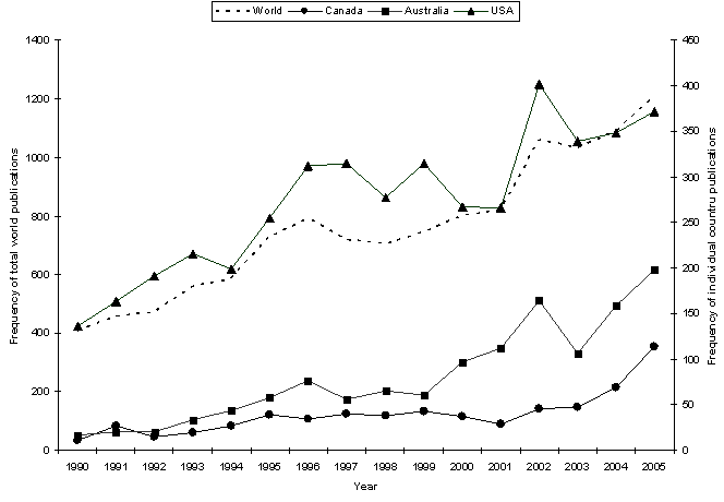 Between 1990 and 2005, total world yearly publications increased from 410 to 1207, while the contribution from Australia increased from 17 (4.1%) to 198 (16.4%), compared with Canada, from 10 (2.4%) to 110 (9.1%). Even though the US publications increased from 131 to 298, the percentage of US publications relative to the world total decreased from 32.0% to 24.7% over the period.