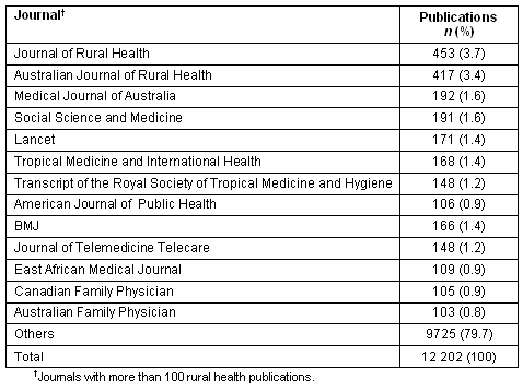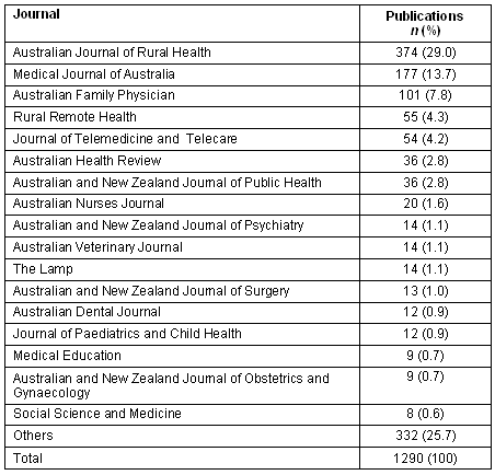 For the period 1990 to 2005, the journals that had more than 100 'rural health' publications are listed in Table 1. Two of the top three and three of the top 13 were Australian publications.