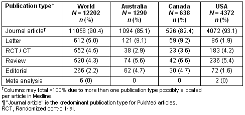 Table 3: Frequency of PubMed publication types from 1990 to 2005 in the world, Australia, Canada and USA