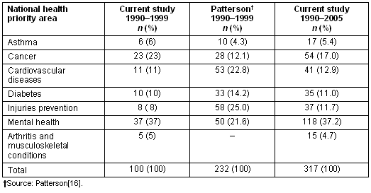 Comparison of our results with those of Patterson is interesting and highlights some of the issues associated with literature reviews. Although our technique has its limitations, especially if authors do not use the appropriate key words, it is replicable by others. However the technique used by Patterson is time-consuming and not suitable for the type of time series or international comparisons that we have been able to produce. Furthermore Patterson has not provided enough information to allow her technique to be undertaken by others with any certainty that the same results would be obtained. Our results show a much lower proportion of articles addressing the NHPAs of cardiovascular diseases, diabetes and injuries than for Patterson. The reason for this is unclear and could only be explained by a hand search of the journals accessed by Patterson to determine why we did not detect the relevant articles.