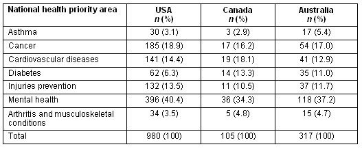 Table 5 compares numbers and proportions of publications that address the Australian NPHAs by Australian, US and Canadian journals. The proportion of total publications from the USA and Canada were slightly lower than for Australia - 980 of 4374 (22.4%) and 105 of 638 (16.5%), respectively, vs 317 of 1290 (24.9%) - although the relative proportions of studies across the NPHAs were remarkably similar among the countries.
