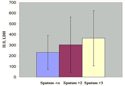 Serum levels of certain pathologically important isozymes, such as LDH, were estimated (Fig 4; serum LDH level has been reported to be elevated in the presence of tissue injury and damage2). In sputum-positive cases, the total serum LDH was found to be significantly elevated (p<0.0001), with mean values of 304.31 ± 252.1 IU in sputum two-positive individuals, and 365.63 ± 262 IU in sputum three-positive individuals, compared with the sputum-negative sample of 232 ± 155.91 IU. There was no association of disease with sex.