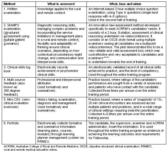 Assessment can have many purposes. In an ideal world the most important aim of assessment is to inspire, measure and guide learning14. For ACRRM, the purpose was also to enable summative judgments about a candidate's level of competence and safety to practise in rural and remote locations; to identify and provide educational guidance and support for poorly performing candidates, and to allow for external certification15.