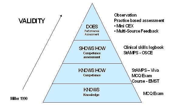 The assessment program was structurally based on the learning and performance benchmarks of Miller's Pyramid (Fig221). This model diagrammatically represents a behavioural approach to teaching, learning and assessment with four progressive hierarchical phases of competence. The first is that the candidate 'knows', the second that they 'know how', the third that they can 'show how' and, finally, what the candidate actually 'does' in the workplace22. Assessment methods were then allocated to each phase based on the literature, with the greatest importance being attributed to the higher levels of the pyramid. For example, multiple choice questions (MCQ) are best for the testing of knowledge, which indicates what the candidate knows, and are therefore placed at the bottom of the pyramid and built upon.