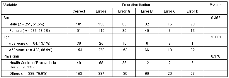 Gender was not associated with the presence of errors (p = 0.352). In contrast, the probability of inaccuracy rose as the age of the deceased increased. Errors were present in 63.8% (270/423) of the death certificates in deceased individuals ≥60 years of age, and in 39.1% (25/64) in individuals ≤59 years (p<0.001).