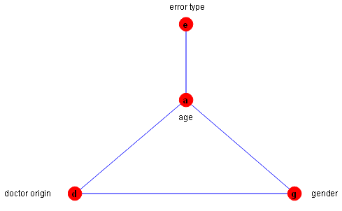 With regard to the state of independence among the variables 'gender', 'error type', 'age' and 'doctor origin', investigation was performed by considering the class of discrete graphical models16. According to this method, a graph is formed consisting of nodes; each node represents a variable. The presence of connecting lines (undirected edges) between the nodes can be interpreted in terms of conditional independence between them. With regard to the evaluation of dependence between the different variables, we started from the saturated model that represents the model of no independence between any two nodes, and we performed statistical significance tests in order to examine whether a simpler model could fit the data within acceptable limits. The tests were based on the Akaike Information Criterion (AIC) score, which takes into consideration quality of fit, as well as the model's complexity. This procedure, called backward selection, attempts to delete existing edges in a stepwise manner. The process ends when no significant reduction of ΑIC score is achieved and the model chosen best fits the data. MIM 3.2 was used for the analysis. The significance level was set at 0.05.
