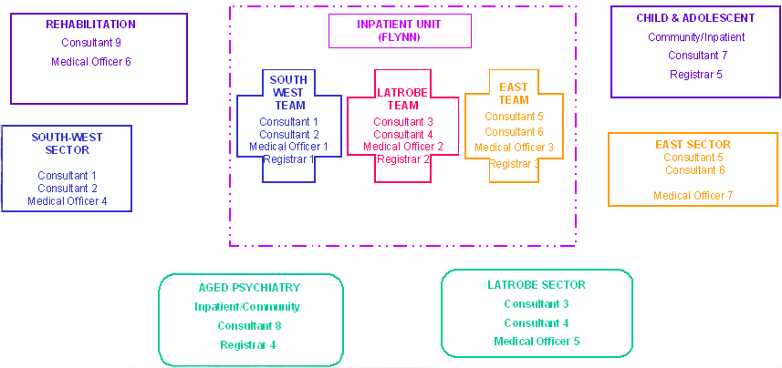 Medical staff structure: The sectorised medical staff structure implemented in 2001 is outlined in Figure 3. The model provides for sector psychiatrists to have responsibility for the overall care of sector clients both in the community and as inpatients, with the further support of medical officers and registrars (doctors appointed to accredited specialist training position or who hold a position designated as such by the hospital). The continuity of patient care and less demanding travel requirements resulting from clear division of responsibilities and shared workloads proved particularly attractive to the psychiatrists.