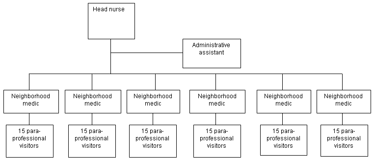 Dr Meyers' home visiting program was expanded to reach the whole Jewish community in Addis Ababa. It was run by an Ethiopian nurse with one administrative assistant (Fig1). They sent six medics (who had had a 3 year training in Ethiopia) to different neighborhoods, and each of these directed and supervised 15 para-professionals with minimal training, who made weekly home visits to 40-50 families, identifying sickness, malnutrition and non-compliance with childhood vaccination. They also had the authority to supply extra blankets or donated clothing when necessary.