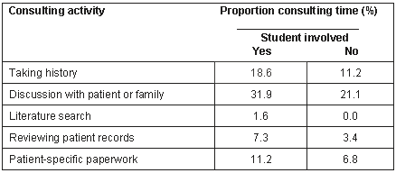 There was no significant difference in the percentage of consultations in which a referral was given when a student is present. However, when a student was present, the proportion of consultations in which a laboratory investigation was ordered increased by 15% (p<.05). Less than 10% of the consultation time was spent on student-related activities.