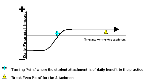 This model acknowledges that for a period of time following the commencement of an attachment the practice will experience decreased income due to the time needed for the student to become familiar with the practice and for the practitioner to ensure the student has necessary skills. At some point between 4 weeks (Vinson's evidence) and 5 months (when the present authors first collected data) the student ceases to be a financial burden on the practice and becomes a financial benefit to the practice. This has been refered to as the turning point. The break-even point is the length of time needed in a practice in order for the latter financial benefit to counter the earlier loss.