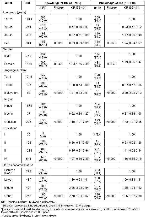 Table 1 shows factors influencing knowledge of diabetes mellitus and DR. Knowledge about diabetes mellitus was noted in 966 individuals (49.9%), and about DR, in 718 individuals (37.1%). Multiple logistic regression analysis indicated that knowledge of diabetes was significantly higher among women compared with men (OR=1.93; 95% CI: 1.55-2.39), Christians compared with Hindus (OR=1.48; 95% CI: 1.07-2.04) and in those with upper socioeconomic status compared with extreme lower socio-economic status (OR=2.60; 95% CI: 1.84-3.67). Knowledge of DR was significantly higher among subjects speaking the Malayalam language, compared with those speaking the Tamil language (OR=3.80; 95% CI: 2.03-7.13), Christians compared with Hindus (OR=1.73; 95% CI: 1.27-2.35), and in those of upper socioeconomic status, compared with extreme lower socio-economic status (OR=1.85; 95% CI: 1.32-2.58).