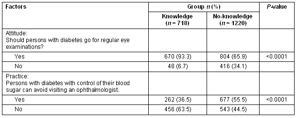 Table 2 describes the attitude and practice patterns between the knowledge and no-knowledge groups. It shows that a higher percentage (93.3%, p<0.0001) of individuals having knowledge about DR felt that a person with diabetes needs to go for regular eye examination (showing correct attitude) compared with the no-knowledge group of DR. Of individuals who did not have knowledge about diabetic retinopathy, a higher percentage (55.5% p<0.0001) felt that if they kept their blood sugar under control they could avoid visiting an ophthalmologist (showing poor practice pattern).