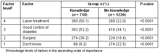 Table 3 shows that individuals with knowledge about DR knew more about various treatment options to treat DR: good control of diabetes (53.2%), laser treatment (50.1%) and surgery (38.2%); whereas, the no-knowledge group subjects knew about available treatments for DR in lesser proportions, that is laser treatment (22.1%), good control of diabetes (34.1%) and surgery (18.4%).