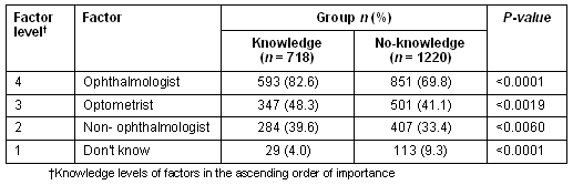 Table 4 shows that the knowledge group (for diabetic retinopathy) predominantly goes to an ophthalmologist (82.6%), less often to an optometrist (48.3%) and a non-ophthalmologist (39.6%). Individuals in the no-knowledge group showed a different pattern of preference for visiting an ophthalmologist (69.6%), an optometrist (41.1%) and a non-ophthalmologist (33.4%) in the event of eye problem.
