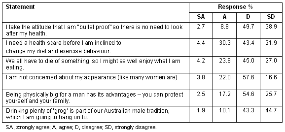 The men in this study held a number of less desirable attitudes to health and body image. Not one respondent disagreed with all of the attitudinal statements. Approximately one-third of them needed a health scare before they were inclined to change diet and physical activity patterns; approximately one in four cared little about their appearance and thought that they have 'to die of something, so they might as well enjoy what they are eating'; and 20% held the view that 'being physically big for a man has its advantages'. About 12% of the men intended to continue 'drinking plenty of grog' and a similar proportion took the attitude that they were 'bullet-proof' and did not need to look after their health. Incorporating attitudes to food and exercise into this survey was based on the hypothesis that attitudes can affect behaviour. This survey found that the men who held these attitudes were significantly more likely to have a poorer diet. The associations between attitudes and physical activity were less clear, but in some cases the men who agreed with many of the attitudes described were less likely to be active.