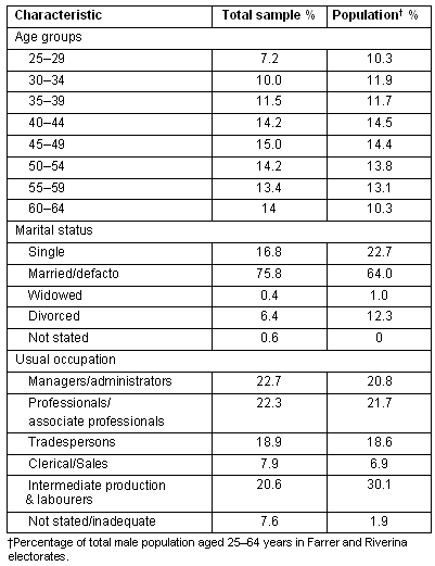 A profile of the survey respondents is presented in Table 2. They appear reasonably representative of the Farrer and Riverina electorates' adult male population, with the exception that younger men were under-represented in the study sample, while the oldest age group was over-represented29. There were also more married men and fewer divorced men than could be expected, and the occupational category of intermediate production and labourers was under-represented in this study30.