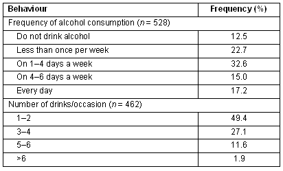 Table 3: Current drinking behaviours of survey respondents. Frequency of alcohol consumption (n = 528)