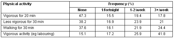 Physical activity: Physical activity habits are recorded in Table 4. Almost half the respondents reported no vigorous activity, a similar number did none or very little physical activity for recreation or sport, however almost 42% of the men reported doing vigorous activity three or more times per week, including heavy gardening, labouring work or chopping wood. Overall, 3.2% of men reported doing no physical activity, and a further 13% of men reported participating in physical activity less than three times per week.