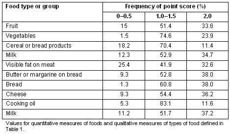 Eating habits: Eating behaviours of the respondents were examined in two ways. First, the types and frequency of major food groups consumed were recorded as a point score (Table 5). Second, the individual Food Habit Scores were totalled to provide an overall score of each man's diet.