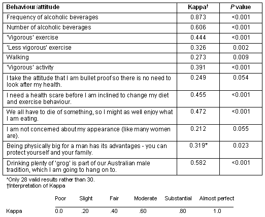A second survey was sent to a subset of 50 men, 3 weeks after the initial survey mail out, to assess the test-retest reliability of the Food Habit Score, alcohol consumption, the physical activity measures and attitudes to health and body image. Cronbach's alpha was used for the normally distributed values in the Food Habit Score, and Kappa for the categorical data in the alcohol consumption, physical activity and attitudinal measures.