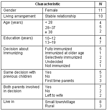 The investigator contacted all but two of the respondents by phone (those two were set aside after numerous attempts to reach them by phone). This allowed respondents to ask questions about the study and gave the investigator an opportunity to gather socio-demographic information. It was hoped this would assist in drawing a purposive sample that represented as broad as possible a variety of ages, education levels, and different decisions about immunization (Table 1). While it was hoped that fathers would be included in the sample, no fathers responded to the call for participation. One potential reason for this was that mothers were more likely to bring their children to classes and clinics without the fathers.